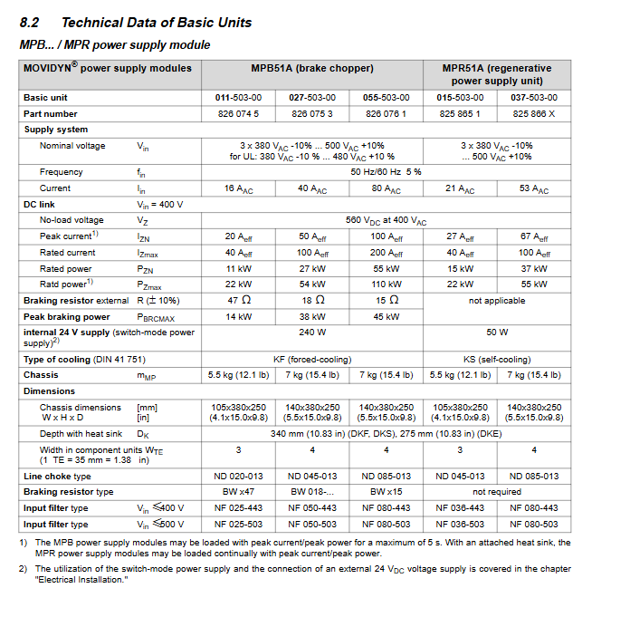 MPB power module with brake chopper, providing DC bus power with rated power of 11~55kW, braking power of 14~45kW, multi axis system power supply, requiring braking energy recovery scenario