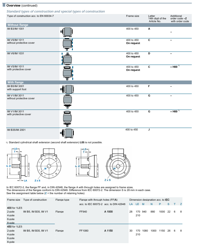 Example: 1LE5534-4AB33-4CB2-Z H00 (IE4 motor, 400 base 4-pole, 400V, IM V5 structure, PTC protection, terminal box left 45 °, with protective cover).