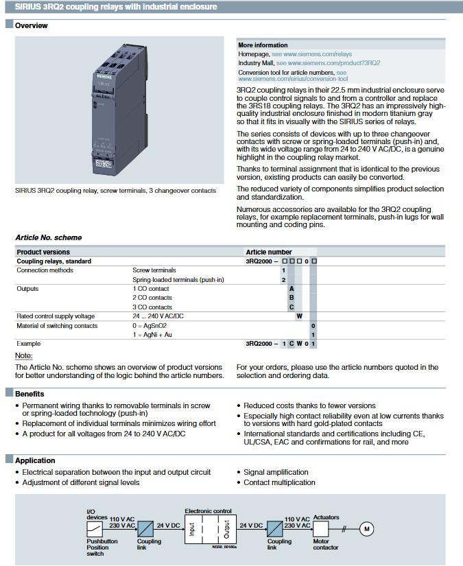 Selection precautions: It is necessary to clarify the "number of contacts → terminal type → contact material → coil voltage", for example, "3RQ2000-2CW01" represents "2 conversion contacts, spring terminals, hard gold-plated contacts, 24-240V AC/DC coils".