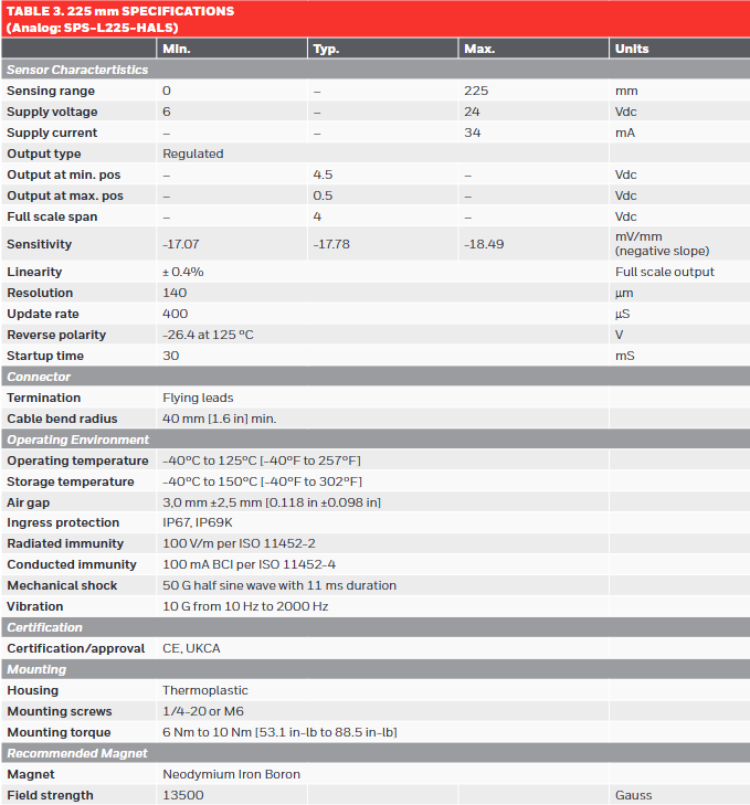 Sensor characteristic detection range: 0-225mm; power supply voltage: 6-24Vdc; Power supply current: maximum 34mA; output type: stabilized voltage type; Minimum position output: typical 4.5Vdc; Maximum position output: typical 0.5Vdc; Full range span: typical 4VDC; Sensitivity: -17.07 to -18.49mV/mm (negative slope, typical -17.78mV/mm); Linearity: ± 0.4% full-scale output; Resolution: 140 μ m; Update rate: 400 μ S; Reverse polarity, startup time consistent with 75mm configuration