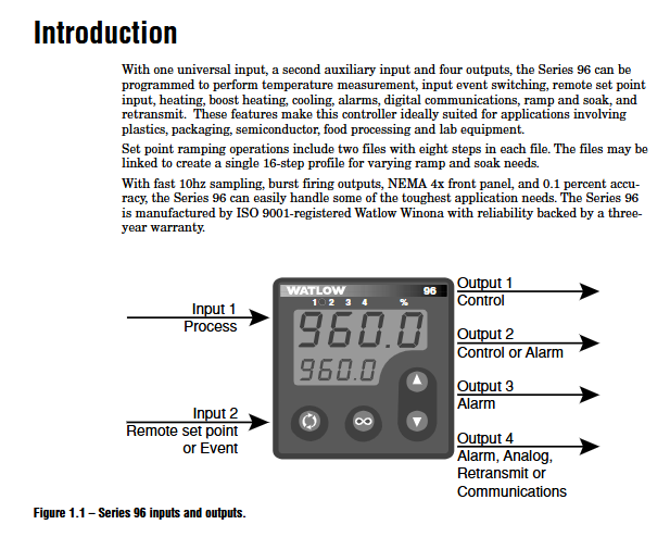The Watlow Series 96 is a 1/16 DIN sized microprocessor based temperature controller with universal input, multi output configuration, and flexible control capabilities, designed specifically for scenarios such as plastic processing, packaging, semiconductors, food processing, and laboratory equipment. The product has high stability and multifunctional scalability as its core advantages, supporting single/dual PID control, curve programming (Ramp/Soak), remote set point retransmission and other functions. Combined with NEMA 4X front panel protection and 0.1% measurement accuracy, it can meet the precise temperature control requirements of harsh industrial environments.