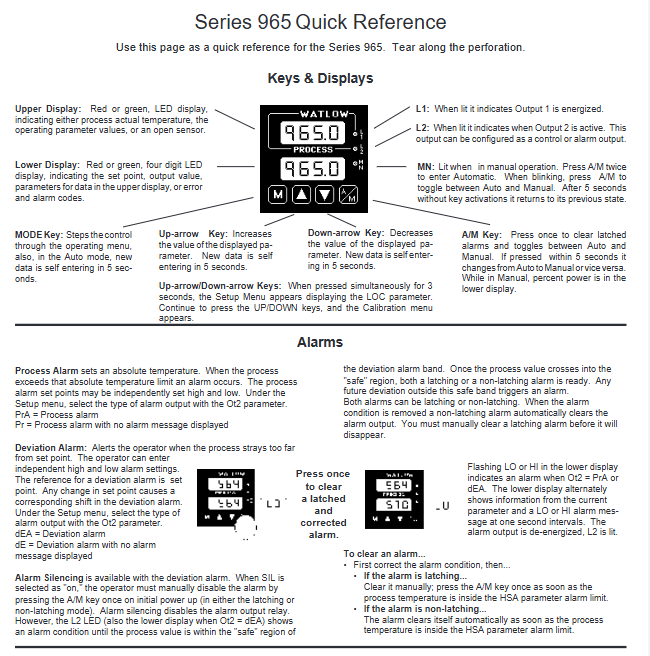 The Watlow Series 965 is a 1/16 DIN microprocessor based temperature controller with a single input dual output design, suitable for industrial temperature control scenarios. The product complies with ISO 9001 standards, has a NEMA 4X (IP65) protection level, supports UL, CE and other certifications, provides a 3-year warranty, and is equipped with dual four digit red/green LED displays. It is easy to operate and balances stability and flexibility.