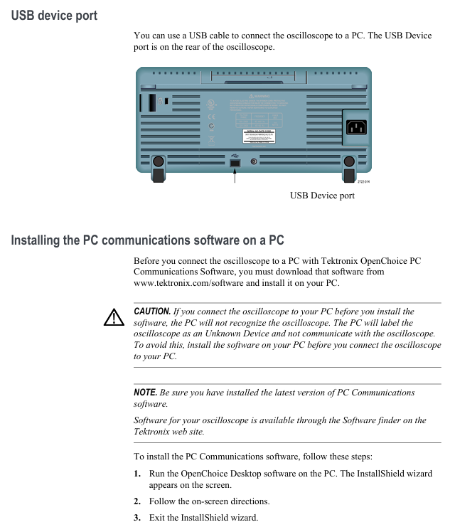 Connect the USB cable between the oscilloscope's rear USB device port and the PC