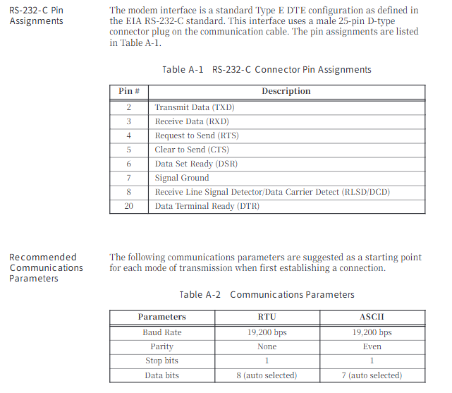10 bit communication dial-up with 8 transmission modes: left=ASCII, right=RTU