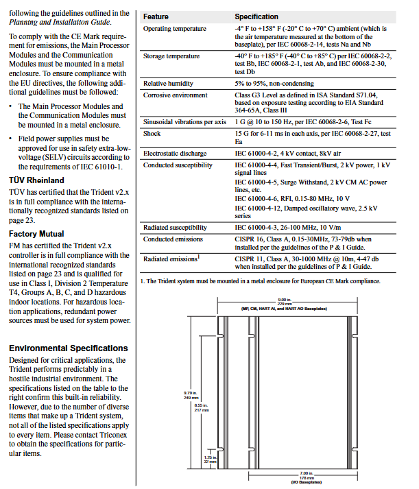 From the perspective of system composition, the Trident series follows a modular design concept and can be divided into four categories: core control modules, I/O modules, expansion components, and supporting accessories. This modular architecture not only reduces the complexity of system deployment, but also enables flexible expansion of functionality - users can flexibly combine different modules according to the point requirements, signal types, and environmental conditions of actual application scenarios, forming a complete control chain from signal acquisition, data processing to instruction output. At the same time, all modules adopt standardized mechanical size design, with I/O modules uniformly measuring 8.65 inches (height) x 1.75 inches (width) x 6.65 inches (depth). The base board is divided into two categories based on function: 9-inch wide (MP, CM, HART type base board) and 7-inch wide (standard I/O base board), ensuring compatibility and interchangeability between modules and providing great convenience for later system upgrades and maintenance.
