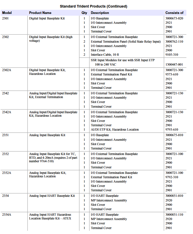 All components of the Trident series are available in flexible delivery options, including TriPak kits, module kits, and individual parts. The TriPak kit is an integrated delivery solution that includes modules and supporting base boards. For example, the main processor TriPak (model 5101) includes 3 MP modules and 1 MP base board kit, while the analog input TriPak (model 5351) includes 1 AI module and 1 AI base board kit, which can be directly used for system deployment; The module kit includes modules, base boards, and necessary interconnect components, while individual components allow users to flexibly purchase and replace according to their actual needs.