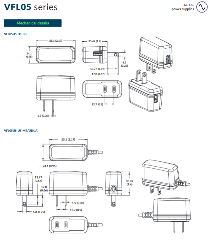 US VFL05US050-US-MB 5.0V 1000mA Mini USB B ±5% 74%