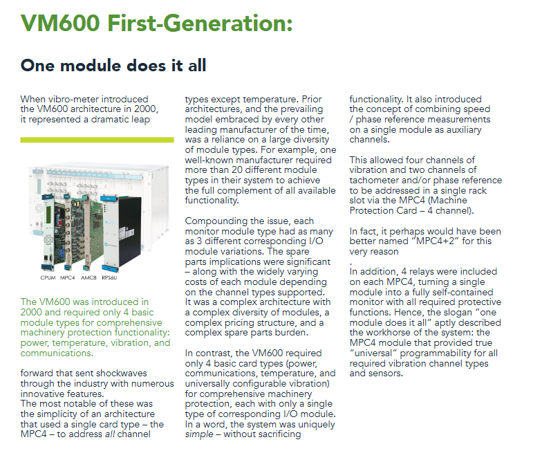 Innovation points of the first generation VM600 (2000): ① Single MPC4 module covers 4 vibration channels and 2 auxiliary channels; ② Physical separation of protection and CM functions (MPC4 protection+XMV16/XC16 CM); ③ Only 4 types of basic modules, simplified spare parts; ④ API 670 Compliance