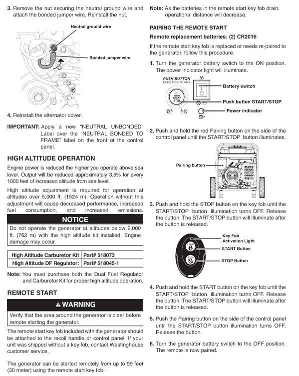 Starting methods include manual start, electric start, and remote start (up to 30 meters away). Remote control needs to be paired first, and the battery model is CR2016 (2 cells)