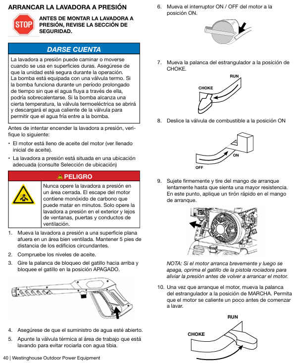 Preprocessing: Confirm that the fuel valve is open, the engine switch is set to "ON", the throttle is set to "CHOKE" (cold start), and the spray gun trigger lock is locked.