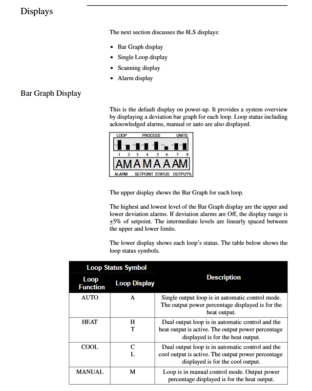 Display mode: default bar chart display (8-loop deviation), single loop display, scan display, alarm display (flashing prompt)