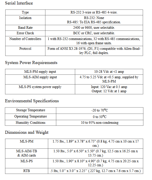 |MLS-AIM | Input 4.75-5.25VDC, current<0.5A | Communicate with MLS-PM through RJ12 cable|