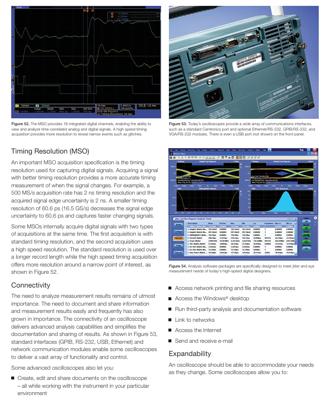 Digital Fluorescence Oscilloscope (DPO) parallel processing (amplification → ADC → digital fluorescence database → direct display, microprocessor parallel processing) real-time 3D display (time, amplitude, amplitude distribution), high waveform capture rate (million level/second), general design and troubleshooting of analog oscilloscope display characteristics (video signal, communication mask testing)
