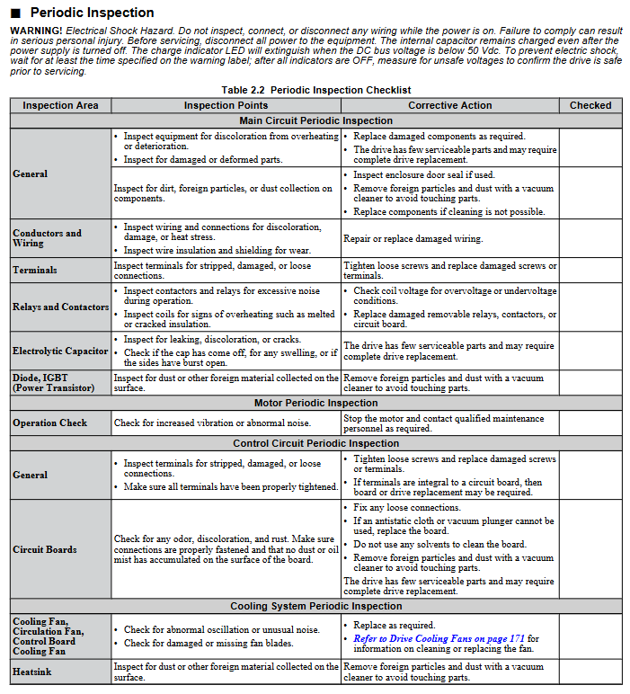 Cooling fan: Replace it after running for 20000 hours or 5 years, and reset the o4-03 parameter after replacement;