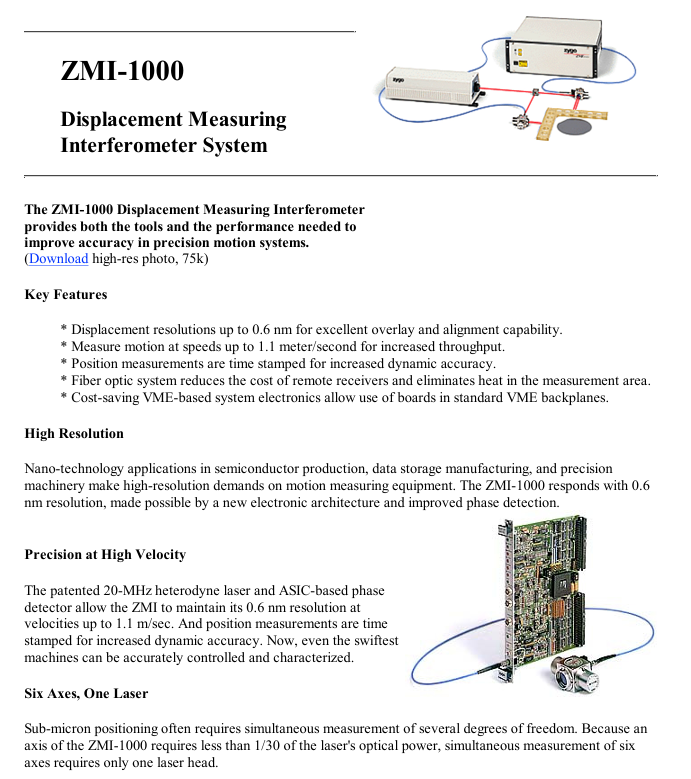 Nano-technology applications in semiconductor production, data storage manufacturing, and precision machinery make high-resolution demands on motion measuring equipment. The ZMI-1000 responds with 0.6 nm resolution, made possible by a new electronic architecture and improved phase detection.