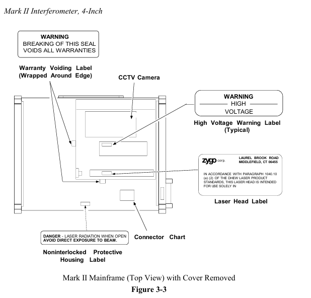 Identification location: There are certification and patent labels (US Patent No. 4201473) and model serial number labels on the back of the host; At the top (when installing the aperture converter), there is a sign that reads "Laser radiation is emitted from this aperture to avoid exposure"; After opening the lid, there are labels such as "Damaged Seal Invalid Warranty", "High Voltage Warning", "Laser Radiation When Opening, Avoid Direct Exposure" (see Figures 3-1 to 3-3).