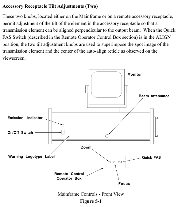 Confirm that the front beam attenuation knob of the host is pushed in, turn on the power switch, and the laser should start within 30 seconds. If it does not start, refer to the troubleshooting section of Service Manual SP-0038; There is a slow melting fuse on the back of the host (see Chapter 6 "Fuse Specifications" for the model).