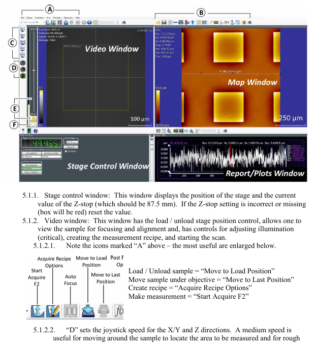 Video Window Stage Loading/Unloading Control, Sample Focusing/Alignment, Light Intensity Adjustment, Measurement Formula Creation, Scan Start with Core Function Icons: "Move to Load Position", "Start Acquire F2", etc