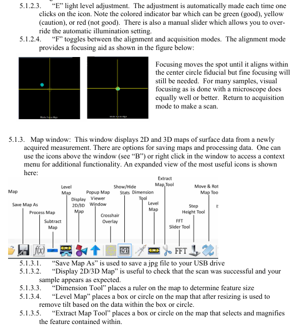 The Map Window displays 2D/3D surface data maps and supports data saving, tilt correction, and area enlargement. Common icons include "Save Map As", "Level Map", and "Dimension Tool"