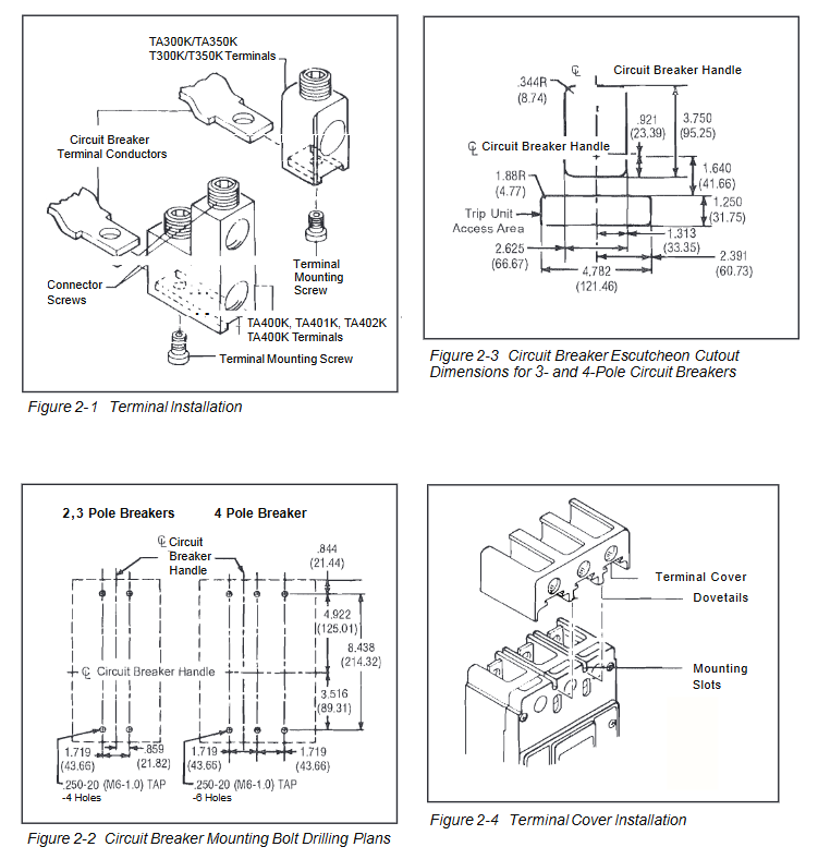 Ladder type terminals (TA400K/TA401K, etc.) must be equipped with matching terminal shields and warning labels must be affixed to the upper part of the circuit breaker cover plate;