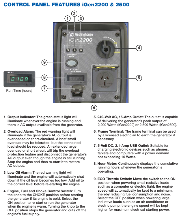 Control switch position error iGen1200: Turn to "ON"; IGen2200/2500: Cold engine to "CHOKE", hot engine to "ON"; IGen4500s: Fuel switch "ON", engine switch "AUTO RUN"