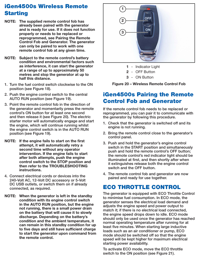 Misstart protection: Special attention should be paid to the remote start function of iGen4500s. When not in use, the engine control switch should be placed in the "STOP" position, and the remote control should be properly stored to avoid accidental start; Before starting the remote control, it is necessary to ensure that there are no safety hazards within the device's line of sight.
