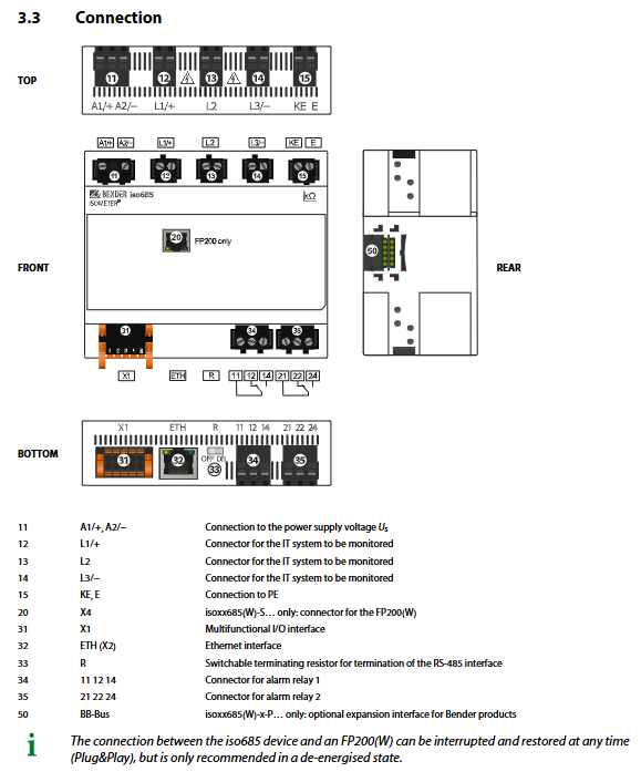 ISOMETER ® Iso685 (W) - D/- S is a professional insulation monitoring equipment developed by Bender, a German company, specifically designed for IT systems (ungrounded AC/DC systems). Its core mission is to detect insulation faults in a timely manner by monitoring key parameters such as insulation resistance and DC offset voltage, avoiding risks such as electric shock and equipment damage. The product is divided into two variants: D-type (integrated graphic LC display and operation buttons) and S-type (no display/buttons, required to be used with FP200 (W) front-end panel), both supporting AC/DC/3 (N) AC system monitoring. With coupling equipment, the rated voltage monitoring range can be extended to 12 kV, meeting the needs of industrial scenarios with different voltage levels.