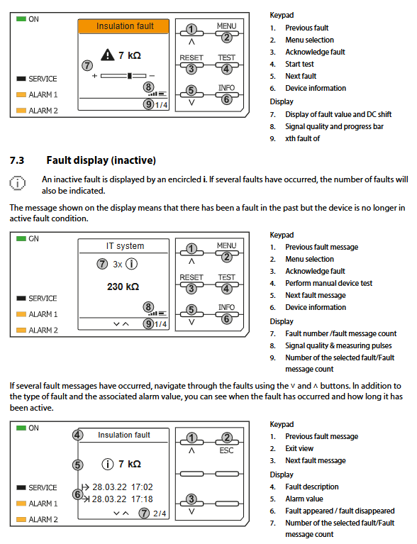 Dual alarm mechanism: When the insulation resistance is lower than the corresponding response value, the relay action and LED indication are triggered, supporting fault memory (maintaining the alarm state until manual reset).