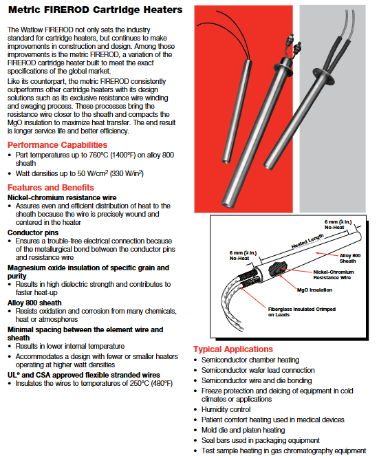Metric FIREROD global adaptation 1400 ° F (760 ° C) 330 W/in ² (50 W/cm ²) meets metric standards, has high dimensional accuracy, and is compatible with international equipment